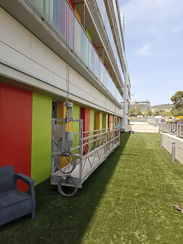 Plataforma colgante de 4 metros de longitud utilizada en un edificio residencial de la provincia de Tarragona para trabajos de reparación y pintura en su fachada trasera.