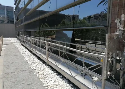 Fuera del residencial, las plataformas suspendidas permiten el tratamiento del hormigón en paramentos verticales de puentes, presas, diques o viaductos, donde el acceso convencional se complica. Y en trabajos de comunicación visual y arte urbano, facilitan la colocación de lonas publicitarias temporales o permanentes, la ejecución de murales en edificios y medianeras, y el cambio de rótulos en oficinas o hoteles con una logística mínima y tiempos muy contenidos.